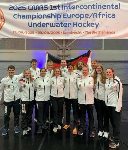 Vom 17.08.25 bis zum 23.08.25 fand die Europameisterschaft im Unterwasser-Hockey erweitert um Teams aus Südafrika und USA in Dordrecht, Niederlande statt.Fünf Spieler und sieben Spielerinnen aus dem TCO traten dabei unter der deutschenFlagge an. In ihrer jeweiligen Gruppe B waren die Gegner der Herren, Polen,Ungarn, Irland, Portugal, Italien, Niederlande und bei den Damen Türkei, Belgien,